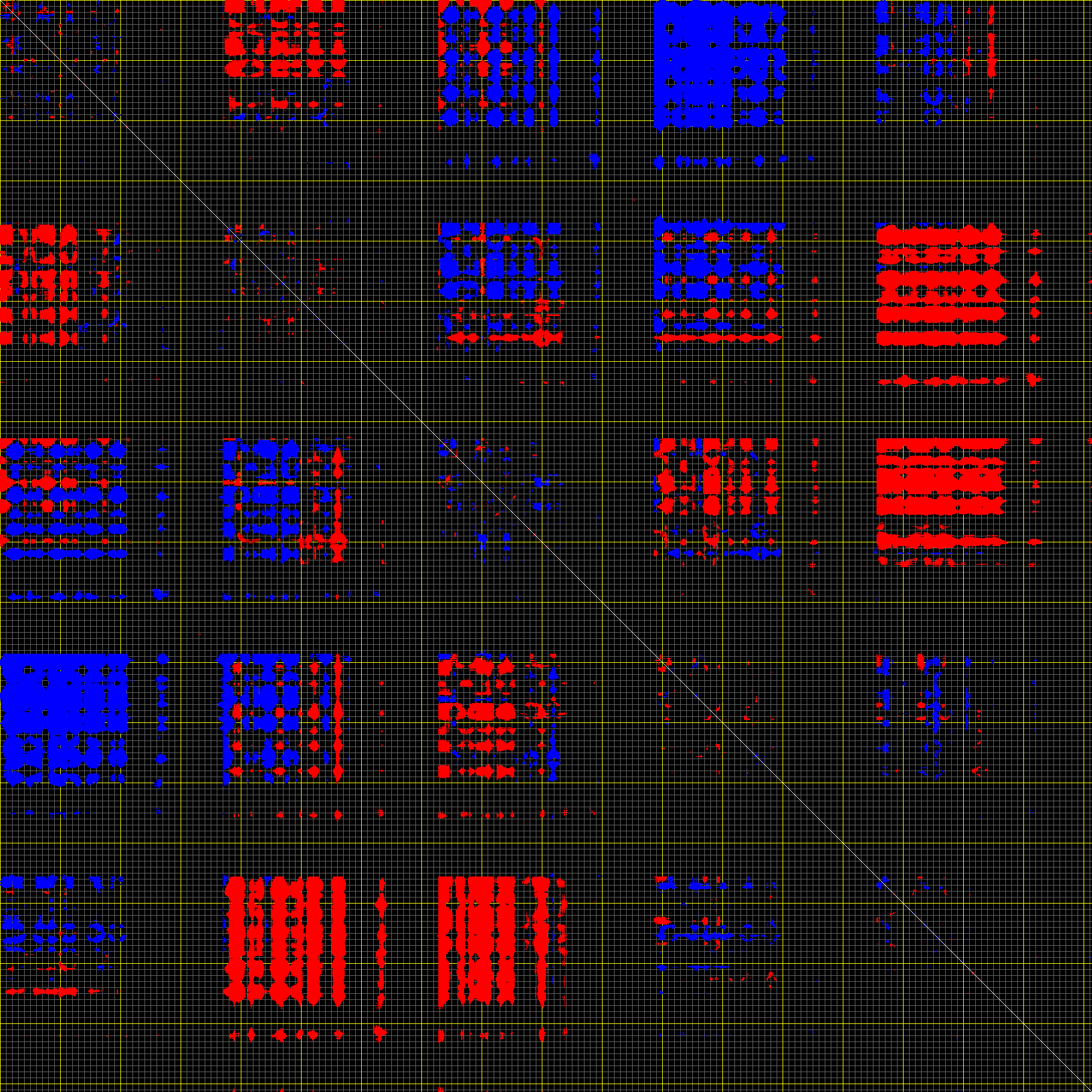 This matrix displays the maximum distance fluctuations between all pairs of CA atoms and between the two extreme conformations that were computed for this mode (DQMIN/DQMAX). Distance increases are plotted in blue and decreases in red for the strongest 10% of the residue pair distance changes. Every pixel corresponds to a single residue. Grey lines are drawn every 10 residues, yellow lines every 100 residues (counting from the upper left corner).