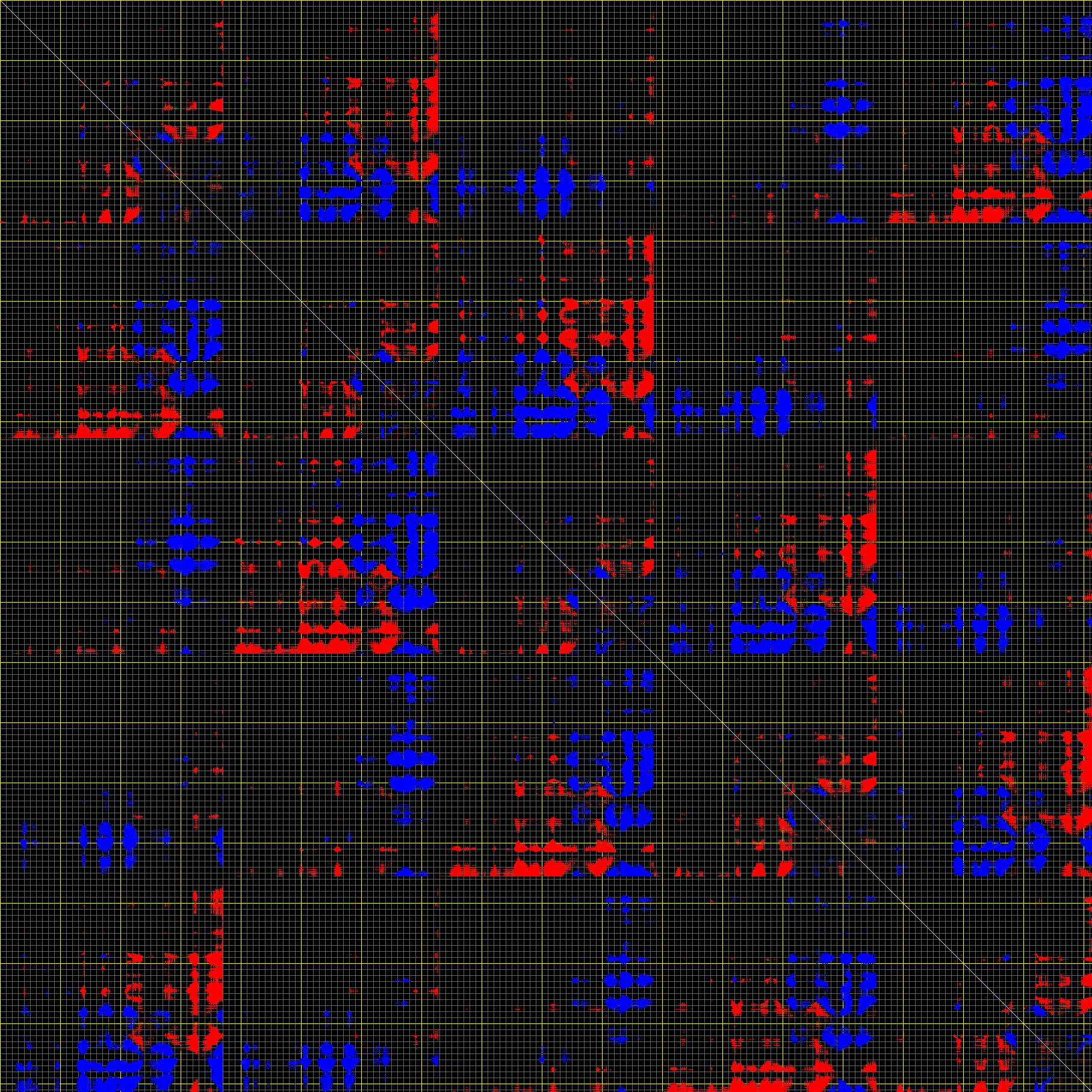 This matrix displays the maximum distance fluctuations between all pairs of CA atoms and between the two extreme conformations that were computed for this mode (DQMIN/DQMAX). Distance increases are plotted in blue and decreases in red for the strongest 10% of the residue pair distance changes. Every pixel corresponds to a single residue. Grey lines are drawn every 10 residues, yellow lines every 100 residues (counting from the upper left corner).