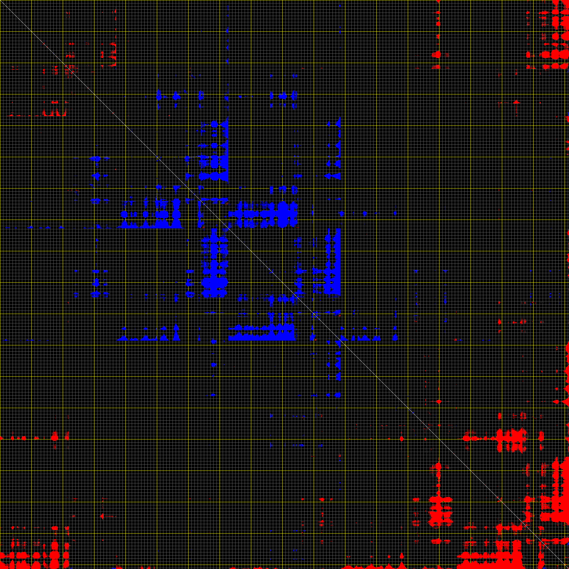 This matrix displays the maximum distance fluctuations between all pairs of CA atoms and between the two extreme conformations that were computed for this mode (DQMIN/DQMAX). Distance increases are plotted in blue and decreases in red for the strongest 10% of the residue pair distance changes. Every pixel corresponds to a single residue. Grey lines are drawn every 10 residues, yellow lines every 100 residues (counting from the upper left corner).