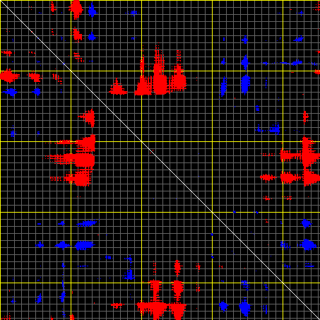 This matrix displays the maximum distance fluctuations between all pairs of CA atoms and between the two extreme conformations that were computed for this mode (DQMIN/DQMAX). Distance increases are plotted in blue and decreases in red for the strongest 10% of the residue pair distance changes. Every pixel corresponds to a single residue. Grey lines are drawn every 10 residues, yellow lines every 100 residues (counting from the upper left corner).