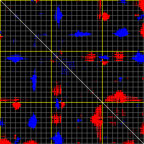 This matrix displays the maximum distance fluctuations between all pairs of CA atoms and between the two extreme conformations that were computed for this mode (DQMIN/DQMAX). Distance increases are plotted in blue and decreases in red for the strongest 10% of the residue pair distance changes. Every pixel corresponds to a single residue. Grey lines are drawn every 10 residues, yellow lines every 100 residues (counting from the upper left corner).
