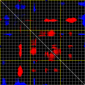 This matrix displays the maximum distance fluctuations between all pairs of CA atoms and between the two extreme conformations that were computed for this mode (DQMIN/DQMAX). Distance increases are plotted in blue and decreases in red for the strongest 10% of the residue pair distance changes. Every pixel corresponds to a single residue. Grey lines are drawn every 10 residues, yellow lines every 100 residues (counting from the upper left corner).