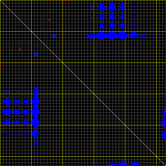 This matrix displays the maximum distance fluctuations between all pairs of CA atoms and between the two extreme conformations that were computed for this mode (DQMIN/DQMAX). Distance increases are plotted in blue and decreases in red for the strongest 10% of the residue pair distance changes. Every pixel corresponds to a single residue. Grey lines are drawn every 10 residues, yellow lines every 100 residues (counting from the upper left corner).