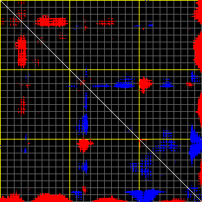 This matrix displays the maximum distance fluctuations between all pairs of CA atoms and between the two extreme conformations that were computed for this mode (DQMIN/DQMAX). Distance increases are plotted in blue and decreases in red for the strongest 10% of the residue pair distance changes. Every pixel corresponds to a single residue. Grey lines are drawn every 10 residues, yellow lines every 100 residues (counting from the upper left corner).