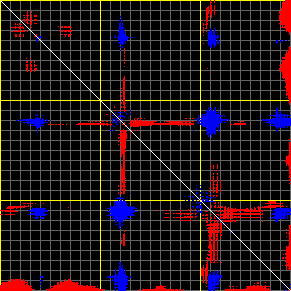 This matrix displays the maximum distance fluctuations between all pairs of CA atoms and between the two extreme conformations that were computed for this mode (DQMIN/DQMAX). Distance increases are plotted in blue and decreases in red for the strongest 10% of the residue pair distance changes. Every pixel corresponds to a single residue. Grey lines are drawn every 10 residues, yellow lines every 100 residues (counting from the upper left corner).