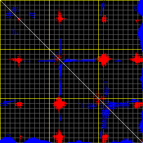 This matrix displays the maximum distance fluctuations between all pairs of CA atoms and between the two extreme conformations that were computed for this mode (DQMIN/DQMAX). Distance increases are plotted in blue and decreases in red for the strongest 10% of the residue pair distance changes. Every pixel corresponds to a single residue. Grey lines are drawn every 10 residues, yellow lines every 100 residues (counting from the upper left corner).