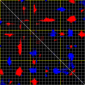 This matrix displays the maximum distance fluctuations between all pairs of CA atoms and between the two extreme conformations that were computed for this mode (DQMIN/DQMAX). Distance increases are plotted in blue and decreases in red for the strongest 10% of the residue pair distance changes. Every pixel corresponds to a single residue. Grey lines are drawn every 10 residues, yellow lines every 100 residues (counting from the upper left corner).