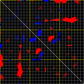 This matrix displays the maximum distance fluctuations between all pairs of CA atoms and between the two extreme conformations that were computed for this mode (DQMIN/DQMAX). Distance increases are plotted in blue and decreases in red for the strongest 10% of the residue pair distance changes. Every pixel corresponds to a single residue. Grey lines are drawn every 10 residues, yellow lines every 100 residues (counting from the upper left corner).
