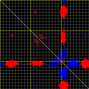 This matrix displays the maximum distance fluctuations between all pairs of CA atoms and between the two extreme conformations that were computed for this mode (DQMIN/DQMAX). Distance increases are plotted in blue and decreases in red for the strongest 10% of the residue pair distance changes. Every pixel corresponds to a single residue. Grey lines are drawn every 10 residues, yellow lines every 100 residues (counting from the upper left corner).