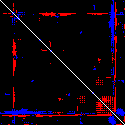 This matrix displays the maximum distance fluctuations between all pairs of CA atoms and between the two extreme conformations that were computed for this mode (DQMIN/DQMAX). Distance increases are plotted in blue and decreases in red for the strongest 10% of the residue pair distance changes. Every pixel corresponds to a single residue. Grey lines are drawn every 10 residues, yellow lines every 100 residues (counting from the upper left corner).
