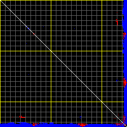 This matrix displays the maximum distance fluctuations between all pairs of CA atoms and between the two extreme conformations that were computed for this mode (DQMIN/DQMAX). Distance increases are plotted in blue and decreases in red for the strongest 10% of the residue pair distance changes. Every pixel corresponds to a single residue. Grey lines are drawn every 10 residues, yellow lines every 100 residues (counting from the upper left corner).