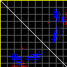 This matrix displays the maximum distance fluctuations between all pairs of CA atoms and between the two extreme conformations that were computed for this mode (DQMIN/DQMAX). Distance increases are plotted in blue and decreases in red for the strongest 10% of the residue pair distance changes. Every pixel corresponds to a single residue. Grey lines are drawn every 10 residues, yellow lines every 100 residues (counting from the upper left corner).
