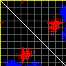This matrix displays the maximum distance fluctuations between all pairs of CA atoms and between the two extreme conformations that were computed for this mode (DQMIN/DQMAX). Distance increases are plotted in blue and decreases in red for the strongest 10% of the residue pair distance changes. Every pixel corresponds to a single residue. Grey lines are drawn every 10 residues, yellow lines every 100 residues (counting from the upper left corner).