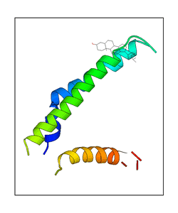 These views are prepared from three orthologuous viewpoints with MolScript. Secondary structures are determined from the C-alpha atom positions of your protein (N-terminal blue, C-terminal red).
