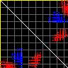 This matrix displays the maximum distance fluctuations between all pairs of CA atoms and between the two extreme conformations that were computed for this mode (DQMIN/DQMAX). Distance increases are plotted in blue and decreases in red for the strongest 10% of the residue pair distance changes. Every pixel corresponds to a single residue. Grey lines are drawn every 10 residues, yellow lines every 100 residues (counting from the upper left corner).