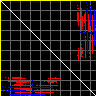 This matrix displays the maximum distance fluctuations between all pairs of CA atoms and between the two extreme conformations that were computed for this mode (DQMIN/DQMAX). Distance increases are plotted in blue and decreases in red for the strongest 10% of the residue pair distance changes. Every pixel corresponds to a single residue. Grey lines are drawn every 10 residues, yellow lines every 100 residues (counting from the upper left corner).