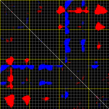 This matrix displays the maximum distance fluctuations between all pairs of CA atoms and between the two extreme conformations that were computed for this mode (DQMIN/DQMAX). Distance increases are plotted in blue and decreases in red for the strongest 10% of the residue pair distance changes. Every pixel corresponds to a single residue. Grey lines are drawn every 10 residues, yellow lines every 100 residues (counting from the upper left corner).