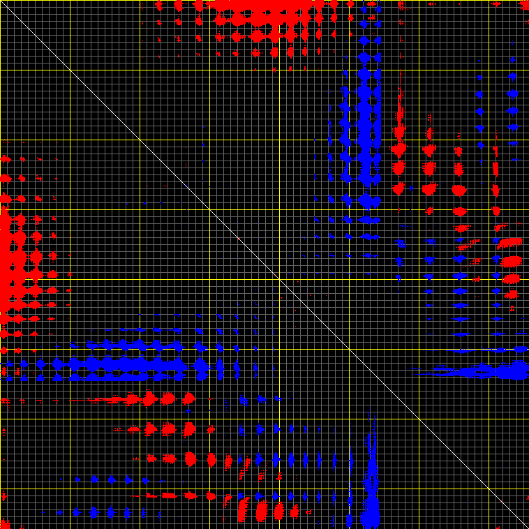 This matrix displays the maximum distance fluctuations between all pairs of CA atoms and between the two extreme conformations that were computed for this mode (DQMIN/DQMAX). Distance increases are plotted in blue and decreases in red for the strongest 10% of the residue pair distance changes. Every pixel corresponds to a single residue. Grey lines are drawn every 10 residues, yellow lines every 100 residues (counting from the upper left corner).