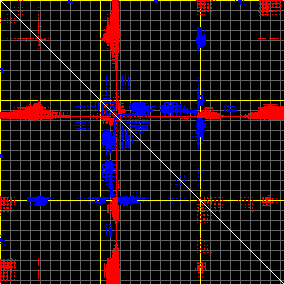 This matrix displays the maximum distance fluctuations between all pairs of CA atoms and between the two extreme conformations that were computed for this mode (DQMIN/DQMAX). Distance increases are plotted in blue and decreases in red for the strongest 10% of the residue pair distance changes. Every pixel corresponds to a single residue. Grey lines are drawn every 10 residues, yellow lines every 100 residues (counting from the upper left corner).