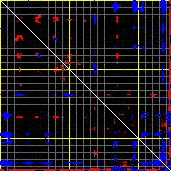 This matrix displays the maximum distance fluctuations between all pairs of CA atoms and between the two extreme conformations that were computed for this mode (DQMIN/DQMAX). Distance increases are plotted in blue and decreases in red for the strongest 10% of the residue pair distance changes. Every pixel corresponds to a single residue. Grey lines are drawn every 10 residues, yellow lines every 100 residues (counting from the upper left corner).