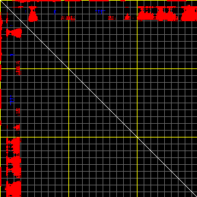This matrix displays the maximum distance fluctuations between all pairs of CA atoms and between the two extreme conformations that were computed for this mode (DQMIN/DQMAX). Distance increases are plotted in blue and decreases in red for the strongest 10% of the residue pair distance changes. Every pixel corresponds to a single residue. Grey lines are drawn every 10 residues, yellow lines every 100 residues (counting from the upper left corner).