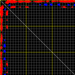 This matrix displays the maximum distance fluctuations between all pairs of CA atoms and between the two extreme conformations that were computed for this mode (DQMIN/DQMAX). Distance increases are plotted in blue and decreases in red for the strongest 10% of the residue pair distance changes. Every pixel corresponds to a single residue. Grey lines are drawn every 10 residues, yellow lines every 100 residues (counting from the upper left corner).