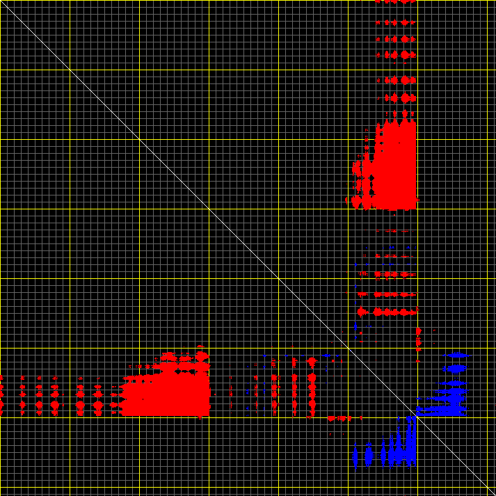 This matrix displays the maximum distance fluctuations between all pairs of CA atoms and between the two extreme conformations that were computed for this mode (DQMIN/DQMAX). Distance increases are plotted in blue and decreases in red for the strongest 10% of the residue pair distance changes. Every pixel corresponds to a single residue. Grey lines are drawn every 10 residues, yellow lines every 100 residues (counting from the upper left corner).