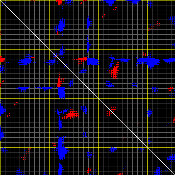 This matrix displays the maximum distance fluctuations between all pairs of CA atoms and between the two extreme conformations that were computed for this mode (DQMIN/DQMAX). Distance increases are plotted in blue and decreases in red for the strongest 10% of the residue pair distance changes. Every pixel corresponds to a single residue. Grey lines are drawn every 10 residues, yellow lines every 100 residues (counting from the upper left corner).