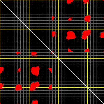 This matrix displays the maximum distance fluctuations between all pairs of CA atoms and between the two extreme conformations that were computed for this mode (DQMIN/DQMAX). Distance increases are plotted in blue and decreases in red for the strongest 10% of the residue pair distance changes. Every pixel corresponds to a single residue. Grey lines are drawn every 10 residues, yellow lines every 100 residues (counting from the upper left corner).