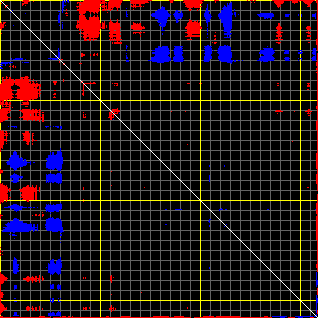 This matrix displays the maximum distance fluctuations between all pairs of CA atoms and between the two extreme conformations that were computed for this mode (DQMIN/DQMAX). Distance increases are plotted in blue and decreases in red for the strongest 10% of the residue pair distance changes. Every pixel corresponds to a single residue. Grey lines are drawn every 10 residues, yellow lines every 100 residues (counting from the upper left corner).