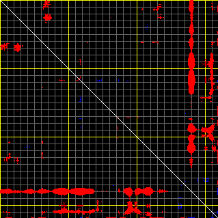 This matrix displays the maximum distance fluctuations between all pairs of CA atoms and between the two extreme conformations that were computed for this mode (DQMIN/DQMAX). Distance increases are plotted in blue and decreases in red for the strongest 10% of the residue pair distance changes. Every pixel corresponds to a single residue. Grey lines are drawn every 10 residues, yellow lines every 100 residues (counting from the upper left corner).