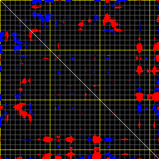 This matrix displays the maximum distance fluctuations between all pairs of CA atoms and between the two extreme conformations that were computed for this mode (DQMIN/DQMAX). Distance increases are plotted in blue and decreases in red for the strongest 10% of the residue pair distance changes. Every pixel corresponds to a single residue. Grey lines are drawn every 10 residues, yellow lines every 100 residues (counting from the upper left corner).