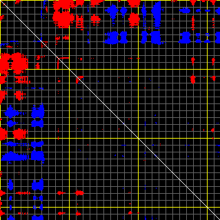 This matrix displays the maximum distance fluctuations between all pairs of CA atoms and between the two extreme conformations that were computed for this mode (DQMIN/DQMAX). Distance increases are plotted in blue and decreases in red for the strongest 10% of the residue pair distance changes. Every pixel corresponds to a single residue. Grey lines are drawn every 10 residues, yellow lines every 100 residues (counting from the upper left corner).