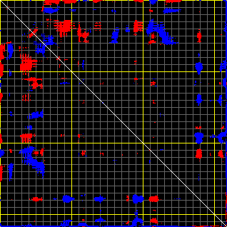 This matrix displays the maximum distance fluctuations between all pairs of CA atoms and between the two extreme conformations that were computed for this mode (DQMIN/DQMAX). Distance increases are plotted in blue and decreases in red for the strongest 10% of the residue pair distance changes. Every pixel corresponds to a single residue. Grey lines are drawn every 10 residues, yellow lines every 100 residues (counting from the upper left corner).