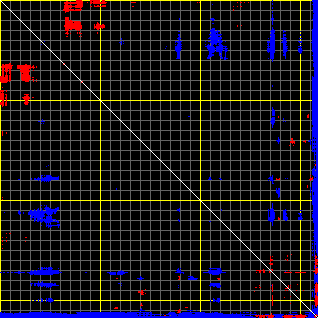 This matrix displays the maximum distance fluctuations between all pairs of CA atoms and between the two extreme conformations that were computed for this mode (DQMIN/DQMAX). Distance increases are plotted in blue and decreases in red for the strongest 10% of the residue pair distance changes. Every pixel corresponds to a single residue. Grey lines are drawn every 10 residues, yellow lines every 100 residues (counting from the upper left corner).
