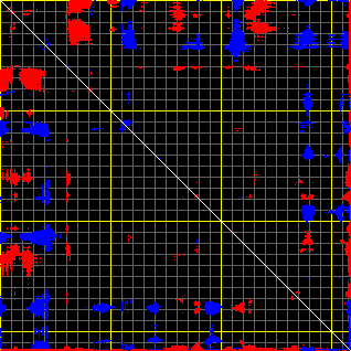 This matrix displays the maximum distance fluctuations between all pairs of CA atoms and between the two extreme conformations that were computed for this mode (DQMIN/DQMAX). Distance increases are plotted in blue and decreases in red for the strongest 10% of the residue pair distance changes. Every pixel corresponds to a single residue. Grey lines are drawn every 10 residues, yellow lines every 100 residues (counting from the upper left corner).