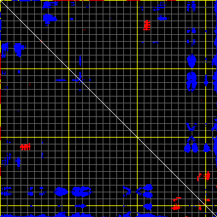 This matrix displays the maximum distance fluctuations between all pairs of CA atoms and between the two extreme conformations that were computed for this mode (DQMIN/DQMAX). Distance increases are plotted in blue and decreases in red for the strongest 10% of the residue pair distance changes. Every pixel corresponds to a single residue. Grey lines are drawn every 10 residues, yellow lines every 100 residues (counting from the upper left corner).