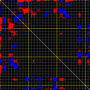 This matrix displays the maximum distance fluctuations between all pairs of CA atoms and between the two extreme conformations that were computed for this mode (DQMIN/DQMAX). Distance increases are plotted in blue and decreases in red for the strongest 10% of the residue pair distance changes. Every pixel corresponds to a single residue. Grey lines are drawn every 10 residues, yellow lines every 100 residues (counting from the upper left corner).