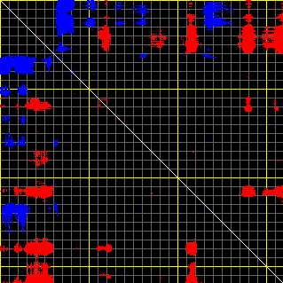 This matrix displays the maximum distance fluctuations between all pairs of CA atoms and between the two extreme conformations that were computed for this mode (DQMIN/DQMAX). Distance increases are plotted in blue and decreases in red for the strongest 10% of the residue pair distance changes. Every pixel corresponds to a single residue. Grey lines are drawn every 10 residues, yellow lines every 100 residues (counting from the upper left corner).