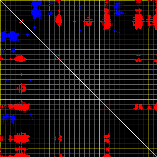 This matrix displays the maximum distance fluctuations between all pairs of CA atoms and between the two extreme conformations that were computed for this mode (DQMIN/DQMAX). Distance increases are plotted in blue and decreases in red for the strongest 10% of the residue pair distance changes. Every pixel corresponds to a single residue. Grey lines are drawn every 10 residues, yellow lines every 100 residues (counting from the upper left corner).