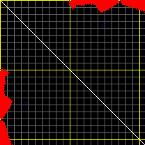 This matrix displays the maximum distance fluctuations between all pairs of CA atoms and between the two extreme conformations that were computed for this mode (DQMIN/DQMAX). Distance increases are plotted in blue and decreases in red for the strongest 10% of the residue pair distance changes. Every pixel corresponds to a single residue. Grey lines are drawn every 10 residues, yellow lines every 100 residues (counting from the upper left corner).
