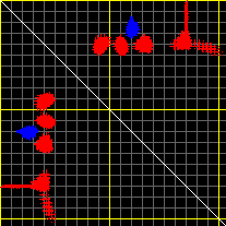 This matrix displays the maximum distance fluctuations between all pairs of CA atoms and between the two extreme conformations that were computed for this mode (DQMIN/DQMAX). Distance increases are plotted in blue and decreases in red for the strongest 10% of the residue pair distance changes. Every pixel corresponds to a single residue. Grey lines are drawn every 10 residues, yellow lines every 100 residues (counting from the upper left corner).