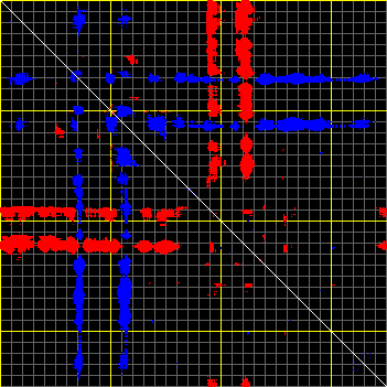 This matrix displays the maximum distance fluctuations between all pairs of CA atoms and between the two extreme conformations that were computed for this mode (DQMIN/DQMAX). Distance increases are plotted in blue and decreases in red for the strongest 10% of the residue pair distance changes. Every pixel corresponds to a single residue. Grey lines are drawn every 10 residues, yellow lines every 100 residues (counting from the upper left corner).