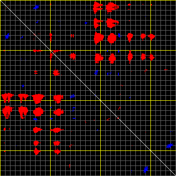 This matrix displays the maximum distance fluctuations between all pairs of CA atoms and between the two extreme conformations that were computed for this mode (DQMIN/DQMAX). Distance increases are plotted in blue and decreases in red for the strongest 10% of the residue pair distance changes. Every pixel corresponds to a single residue. Grey lines are drawn every 10 residues, yellow lines every 100 residues (counting from the upper left corner).