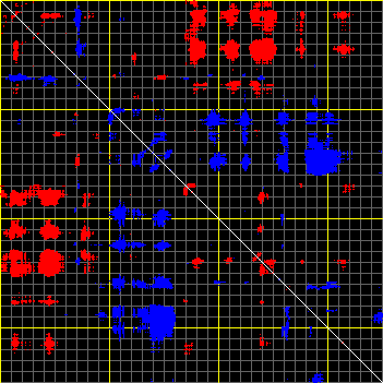 This matrix displays the maximum distance fluctuations between all pairs of CA atoms and between the two extreme conformations that were computed for this mode (DQMIN/DQMAX). Distance increases are plotted in blue and decreases in red for the strongest 10% of the residue pair distance changes. Every pixel corresponds to a single residue. Grey lines are drawn every 10 residues, yellow lines every 100 residues (counting from the upper left corner).