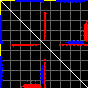 This matrix displays the maximum distance fluctuations between all pairs of CA atoms and between the two extreme conformations that were computed for this mode (DQMIN/DQMAX). Distance increases are plotted in blue and decreases in red for the strongest 10% of the residue pair distance changes. Every pixel corresponds to a single residue. Grey lines are drawn every 10 residues, yellow lines every 100 residues (counting from the upper left corner).