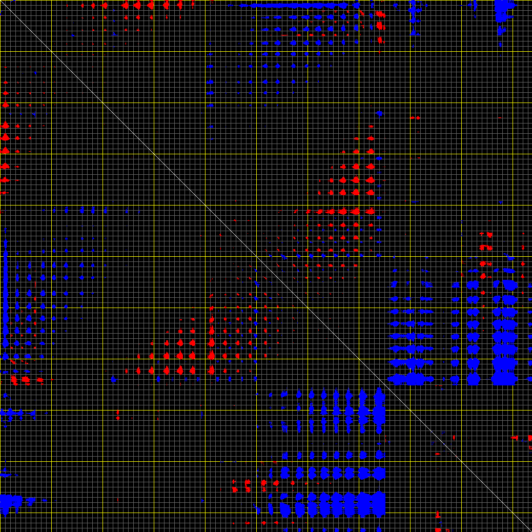 This matrix displays the maximum distance fluctuations between all pairs of CA atoms and between the two extreme conformations that were computed for this mode (DQMIN/DQMAX). Distance increases are plotted in blue and decreases in red for the strongest 10% of the residue pair distance changes. Every pixel corresponds to a single residue. Grey lines are drawn every 10 residues, yellow lines every 100 residues (counting from the upper left corner).