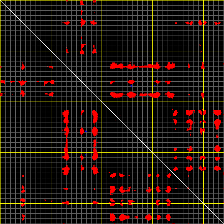 This matrix displays the maximum distance fluctuations between all pairs of CA atoms and between the two extreme conformations that were computed for this mode (DQMIN/DQMAX). Distance increases are plotted in blue and decreases in red for the strongest 10% of the residue pair distance changes. Every pixel corresponds to a single residue. Grey lines are drawn every 10 residues, yellow lines every 100 residues (counting from the upper left corner).