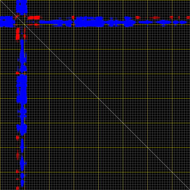 This matrix displays the maximum distance fluctuations between all pairs of CA atoms and between the two extreme conformations that were computed for this mode (DQMIN/DQMAX). Distance increases are plotted in blue and decreases in red for the strongest 10% of the residue pair distance changes. Every pixel corresponds to a single residue. Grey lines are drawn every 10 residues, yellow lines every 100 residues (counting from the upper left corner).