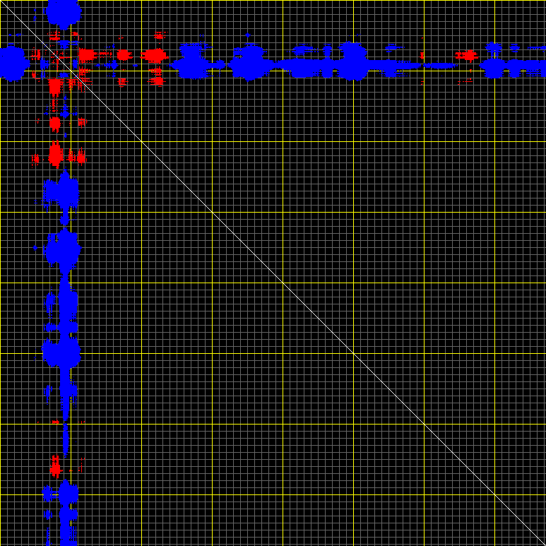 This matrix displays the maximum distance fluctuations between all pairs of CA atoms and between the two extreme conformations that were computed for this mode (DQMIN/DQMAX). Distance increases are plotted in blue and decreases in red for the strongest 10% of the residue pair distance changes. Every pixel corresponds to a single residue. Grey lines are drawn every 10 residues, yellow lines every 100 residues (counting from the upper left corner).